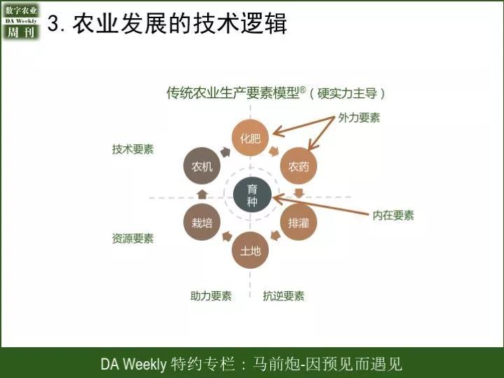 各種技術的跨界和融合將取代單一技術進步。農業生產的基礎要素基本上包含種子、土地、栽培、灌溉、化肥、農機、植保等七個要素。中間的種子技術是“內在要素”,外面的要素可以分為資源要素,技術要素,助力要素和抗逆要素。
