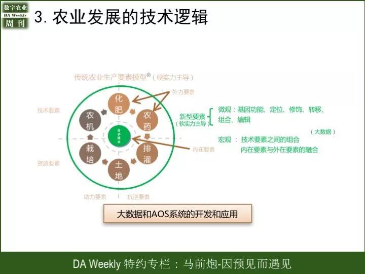 新型要素是什么?主要體現在兩個層面上,第一個是更加微觀的層面,由于分子生物技術出現,基因的功能定位、修飾編輯、轉移融合等從更微觀的層面改變農業的遺傳的規律和發展方向;第二個在宏觀的層面上,技術要素之間的組合、內在和外在要素的融合。而不是靠某一項技術進步來獲得農業整體生產效率的提升。這一項技術的發展主要是依賴農業大數據的實踐和應用的發展。