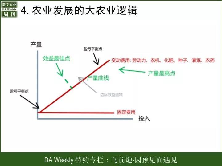 這張圖搞經濟的人一看就明白,但許多做農業的人理解不了。做農業的人一直要追求產量高,而做經濟的人則想要效益最大化。隨著生產投入的增加,農作物的產量就會增加。但是超出了最佳的投入產出的效益點,再增產意味著投入產出比的下降,是與經濟的規律背道而馳的。所以農業作為一個產業,一定是追求效率和效益的最大化,而不是產量的最大化。因為只有這樣才是可持續的。
