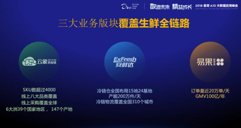我們有三大體系,云象供應鏈,在中國來說,特別在進口生鮮方面一個最大供應鏈公司,安鮮達是我們在全國已經有最大的冷鏈物流配送企業,我們也是菜鳥冷鏈唯一合作商,因為沒有一家可以像我們這樣布到全國的。易果剛才說了,在天貓超市買的所有生鮮都是易果在運營,箱子上寫的安鮮達。