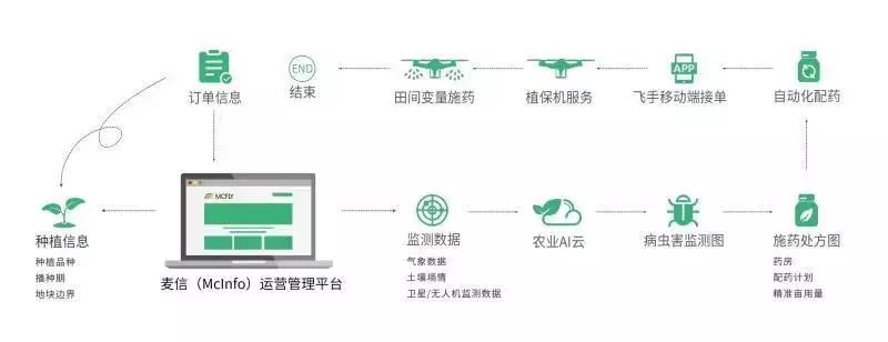 麥飛依托自主知識產權的近地空遙感技術及智慧農業AI算法,為客戶提供精準科學施藥服務。同時,帶遙感監測的無人機在農田上飛行,將獲得的數據傳回云端,AI算法就可以識別出農田是否發生病蟲害并計算出施藥路徑,然后再利用植保機自動給農田噴灑藥物。