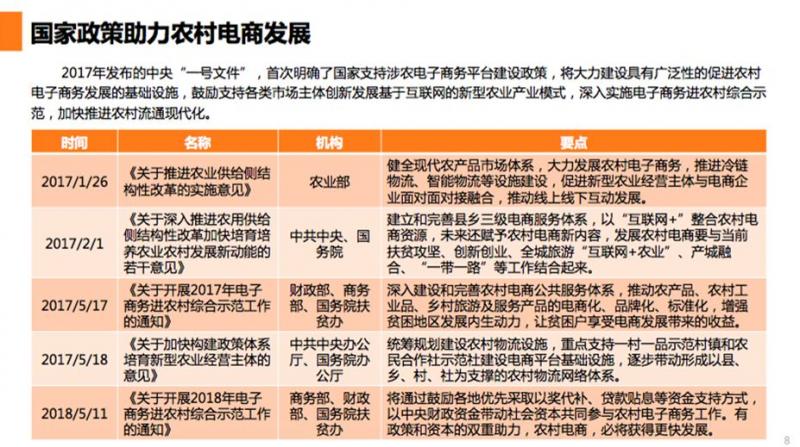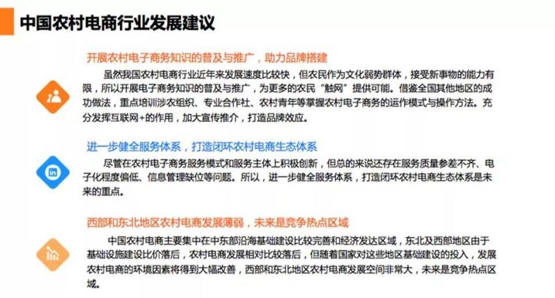 未來(lái)社交電商和社區(qū)電商有望成為農(nóng)村電商的主要模式,在鄉(xiāng)村振興戰(zhàn)略帶來(lái)的新機(jī)遇下,中國(guó)農(nóng)村電商產(chǎn)業(yè)將更加“商業(yè)化”、“品牌化”和“本土化”,完成農(nóng)產(chǎn)品產(chǎn)業(yè)鏈重塑,進(jìn)一步加快發(fā)展。