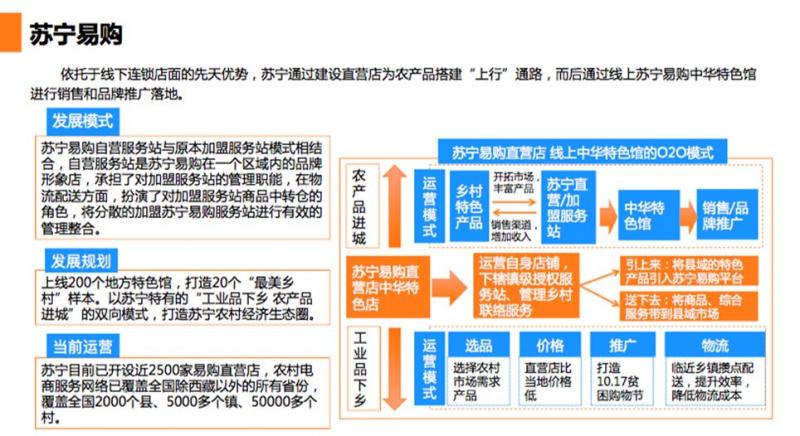 農(nóng)村淘寶、京東3F戰(zhàn)略、蘇寧中華特色館、拼多多社交電商以及唯品會(huì)的唯愛(ài)工坊是中國(guó)農(nóng)村電商的典型平臺(tái),其中蘇寧獲得最佳口碑。