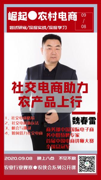 2020年9月8日本周二晚上20點,農業行業觀察、農俠會舉辦“崛起● 農村電商系列課程”繼續開課,我們邀請了首屆中國電商講師大賽總冠軍、電商專家魏春雷(老雷)老師做客分享,歡迎大家來連接與學習…