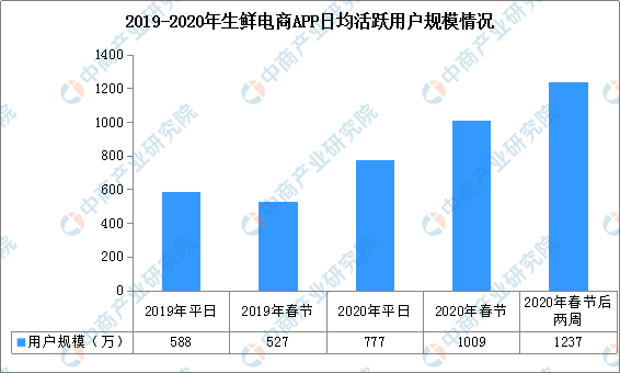由于居家隔離、年貨儲備耗盡等因素,采購生鮮菜品的需求繼續上漲,生鮮電商用戶規模和粘性大幅提升。QuestMobile發布數據顯示,春節期間生鮮電商APP的日均活躍用戶規模突破1000萬,而春節后兩周保持增長突破1200萬,用戶使用時長同比增長96。例如,叮咚買菜/盒馬/每日優鮮春節后兩周DAU增幅分別為165%、59%、94%。