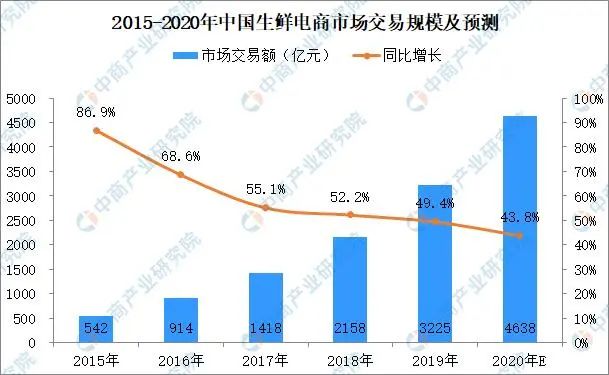 近年來,隨著互聯網的快速發展、年輕消費者消費習慣的改變、冷鏈物流技術的不斷進步,加之新零售的機遇,我國生鮮電商行業保持了較快的發展速度。數據顯示,2019年我國生鮮電商行業市場交易規模約為3225億元,較上年同期增長49.4%。預計未來幾年生鮮電商市場快速發展,2020年我國生鮮電商行業市場交易總額將突破4600億元。