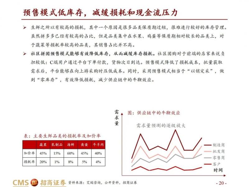(2)社區拼團預售模式能夠有效降低庫存,從而減緩庫存損耗?!耙凿N定采”,做到“零庫存”,有效降低損耗,減少供應鏈中的牛鞭效應。