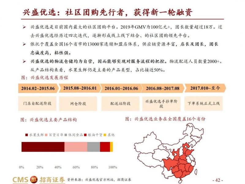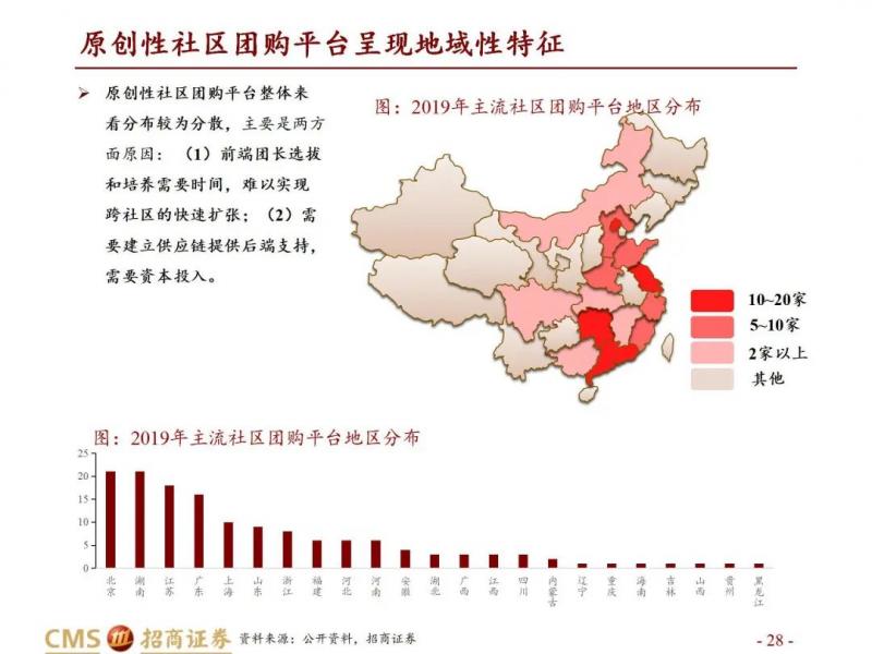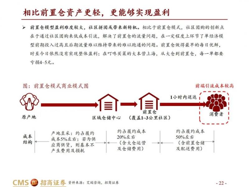 (3)社區團購模型前端固定資產投入較少,模式較輕,同時相比前置倉有較低的引流成本和較少的前端投入,同時將“配送到家”改為“配送到店+自提”,降低了履約成本,更能夠在三四線跑通。