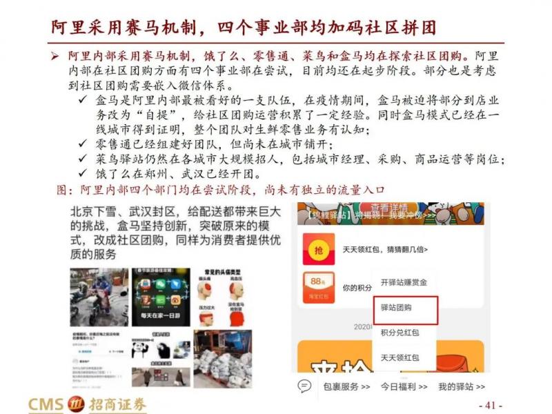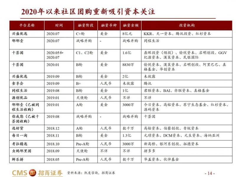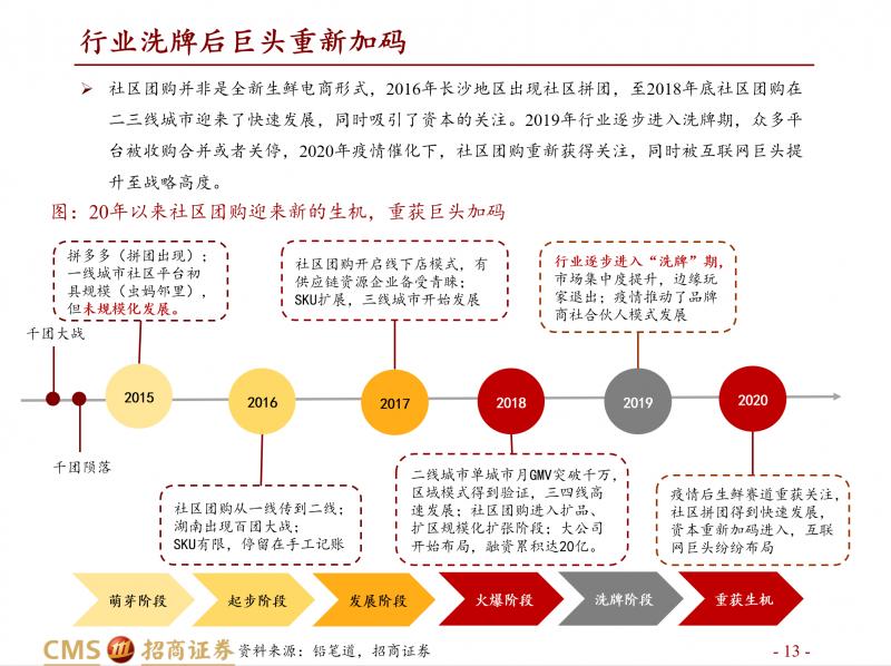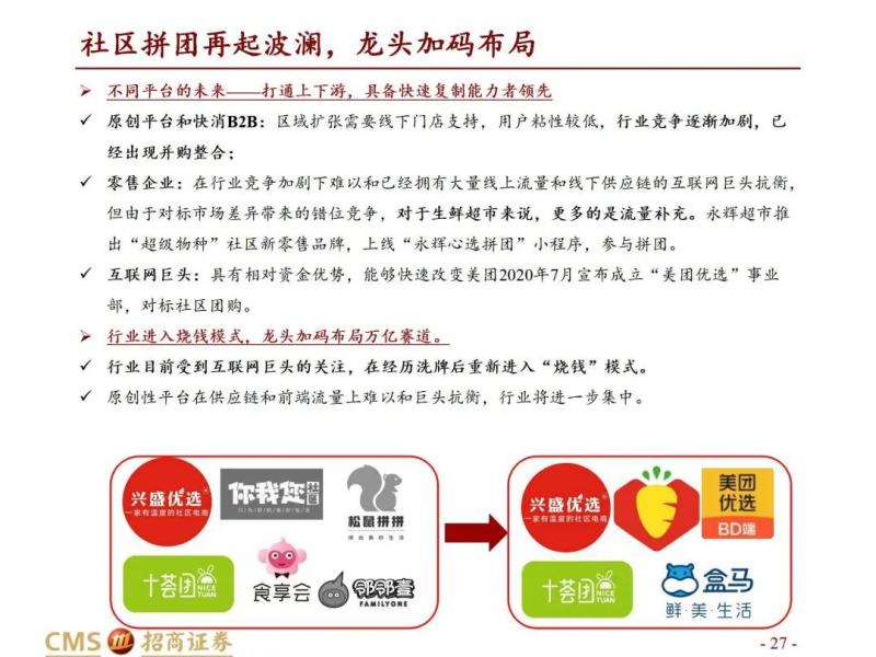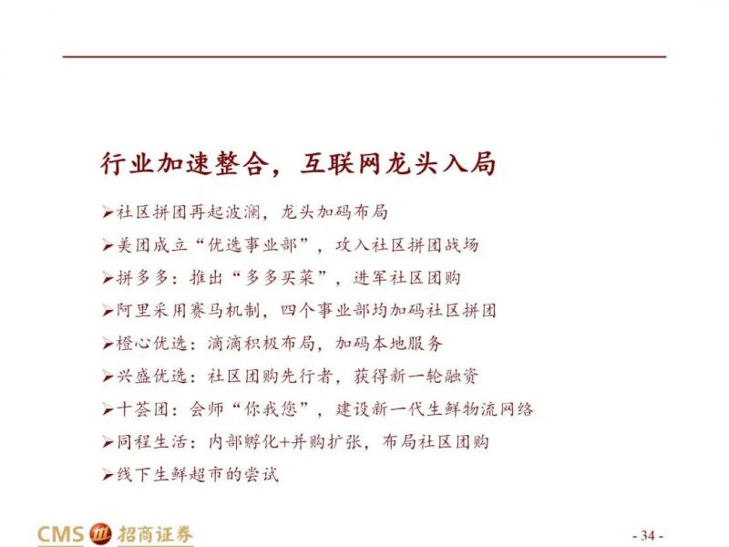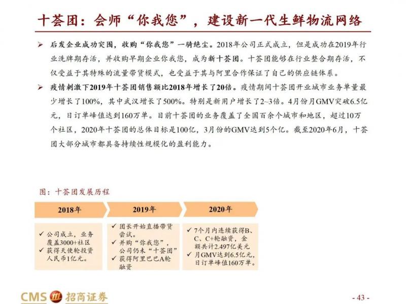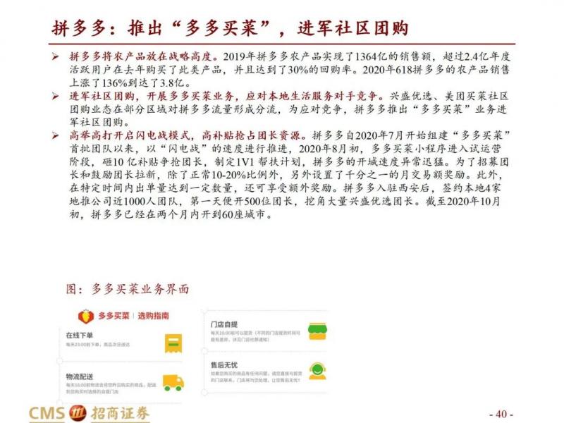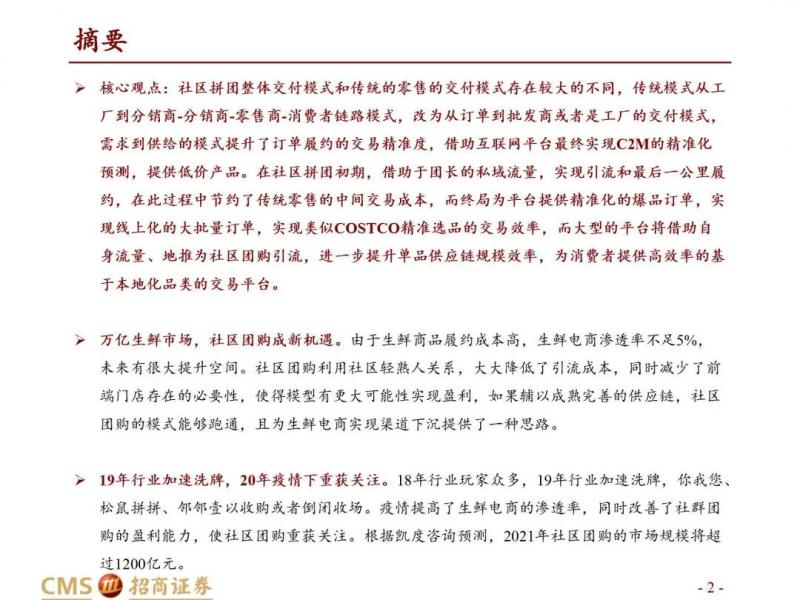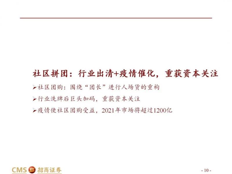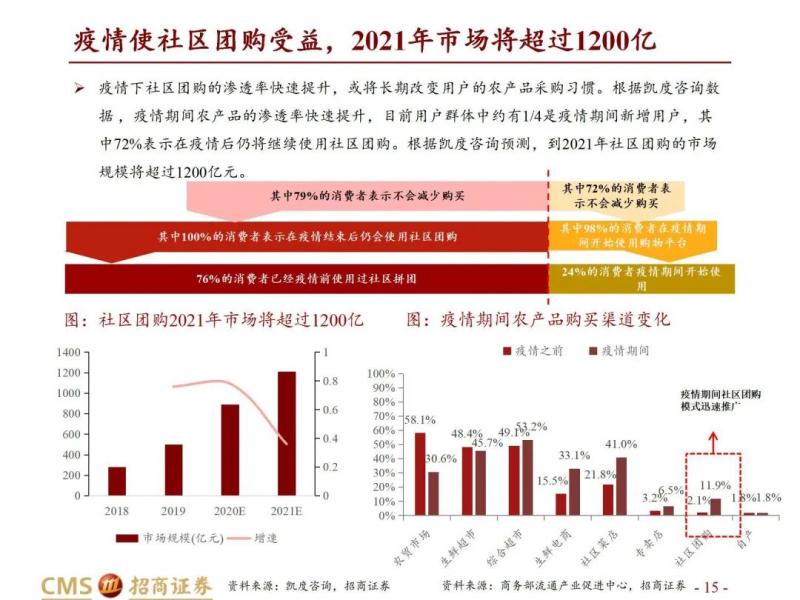 19年行業加速洗牌,20年疫情下重獲關注。18年行業玩家眾多,19年行業加速洗牌,你我您、松鼠拼拼、鄰鄰壹以收購或者倒閉收場。疫情提高了生鮮電商的滲透率,同時改善了社群團購的盈利能力,使社區團購重獲關注。根據凱度咨詢預測,2021年社區團購的市場規模將超過1200億元。