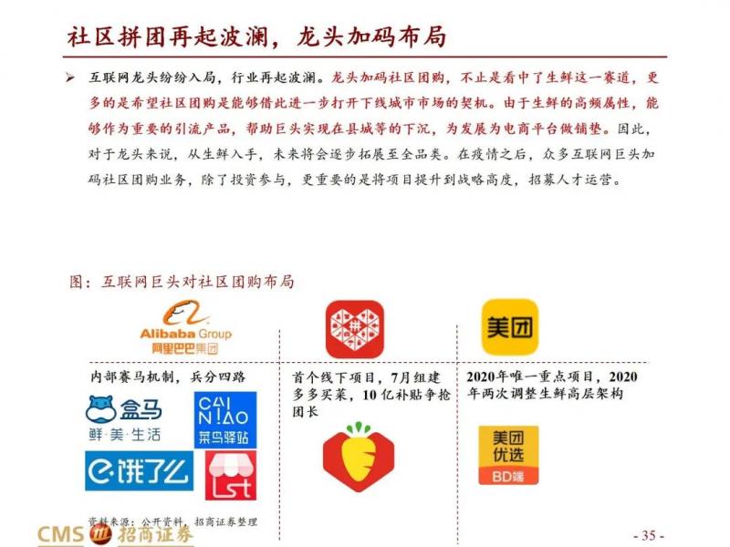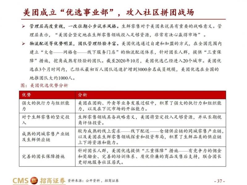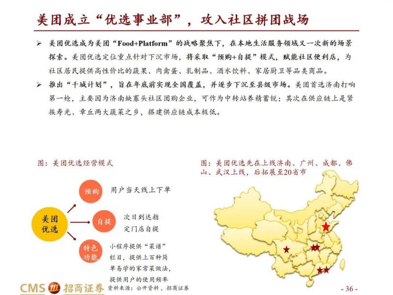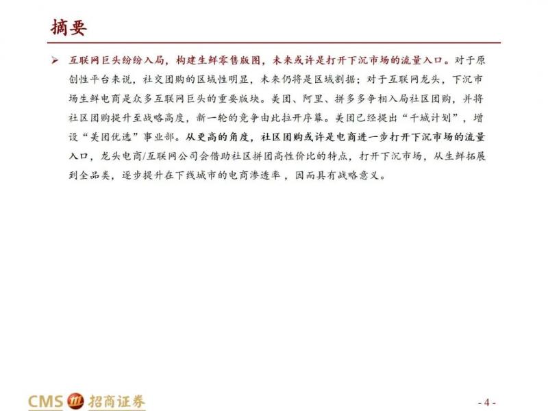 互聯網巨頭紛紛入局,構建生鮮零售版圖,未來或許是打開下沉市場的流量入口。對于原創性平臺來說,社交團購的區域性明顯,未來仍將是區域割據;對于互聯網龍頭,下沉市場生鮮電商是眾多互聯網巨頭的重要版塊。美團、阿里、拼多多爭相入局社區團購,并將社區團購提升至戰略高度,新一輪的競爭由此拉開序幕。美團已經提出“千城計劃”,增設“美團優選”事業部。從更高的角度,社區團購或許是電商進一步打開下沉市場的流量入口,龍頭電商/互聯網公司會借助社區拼團高性價比的特點,打開下沉市場,從生鮮拓展到全品類,逐步提升在下線城市的電商滲透率 ,因而具有戰略意義。