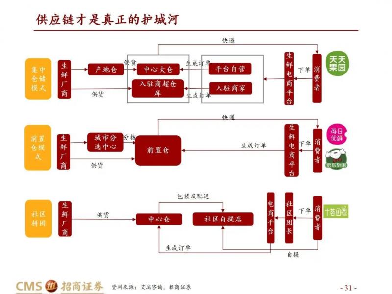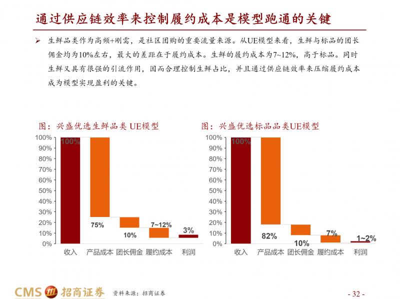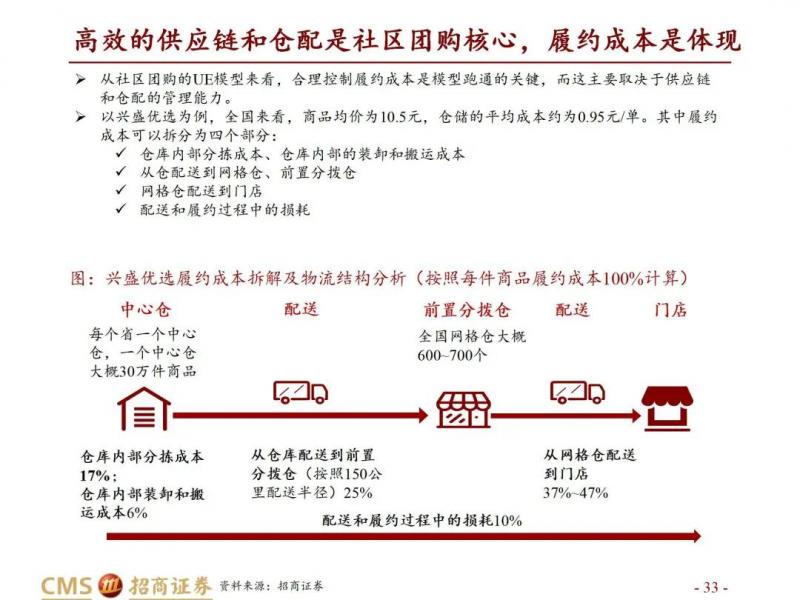 良好的供應鏈是性價比的重要保證。其中頭部團長前期稀缺,長期來看管理需要逐步標準化;而供應鏈才是真正的護城河。團長在社群維護中扮演了較為重要的角色,高度依賴團長的運營管理能力,但是團長資源不具有獨占性,并且忠誠度較低,因而必然會出現早期各大平臺補貼爭搶優質團長資源的情況。從長期來看,社區團購的UE模型中合理控制履約成本是模型跑通的關鍵,而這主要取決于供應鏈/倉配等方位配合的能力。