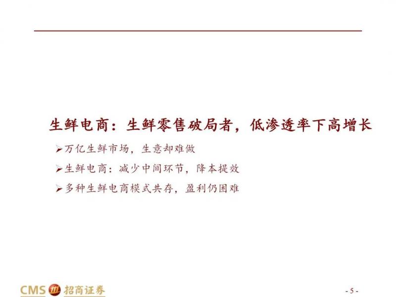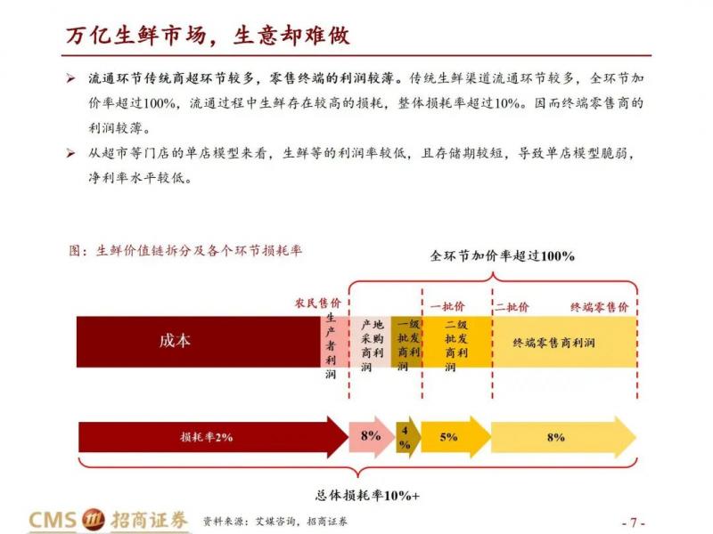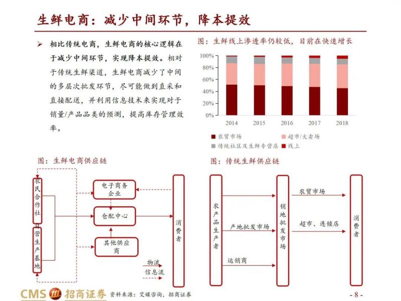 萬億生鮮市場,社區團購成新機遇。由于生鮮商品履約成本高,生鮮電商滲透率不足5%,未來有很大提升空間。社區團購利用社區輕熟人關系,大大降低了引流成本,同時減少了前端門店存在的必要性,使得模型有更大可能性實現盈利,如果輔以成熟完善的供應鏈,社區團購的模式能夠跑通,且為生鮮電商實現渠道下沉提供了一種思路。