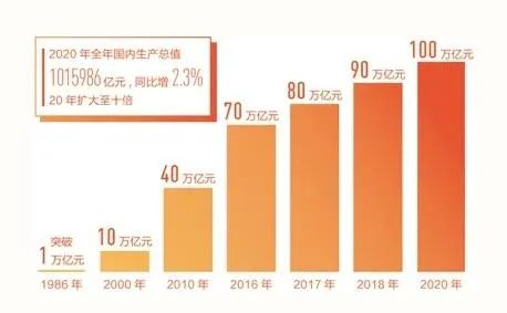 2020年,我國國內生產總值達101.6萬億元,歷史上首次突破100萬億。在過去20年內,經濟總量規模擴大至10倍。