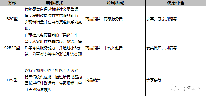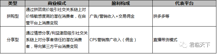 該模式下,平臺依托社交關系鏈促進用戶裂變和商品傳播,按照平臺商品是否自營同樣可分為2類,具體的商業模式與盈利構成如下表: