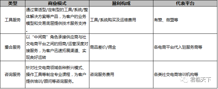 該模式下,平臺依托基于大數據、新技術的專業服務為社交電商各個環節賦能,按照提供的服務類型可分為以下3類: