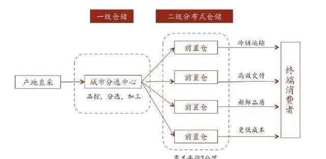 生鮮電商主要盈利模式為前置倉模式,而前置倉模式,是指更靠近消費者的小型倉儲單位,一般設置在消費者集中的社區附近。其運營模式是:生鮮產品銷售方利用冷鏈物流(冷藏車)提前將產品配送至前置倉存儲待售,客戶下單后,由前置倉經營者組織完成包裹生產和“最后一公里”的上門配送。無論是訂單響應速度還是配送成本,前置倉模式相比直接配送都具有很大優勢。