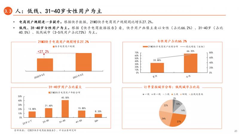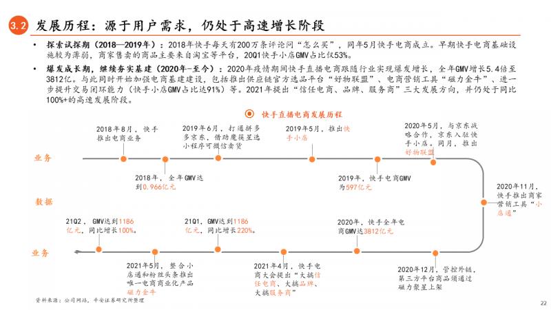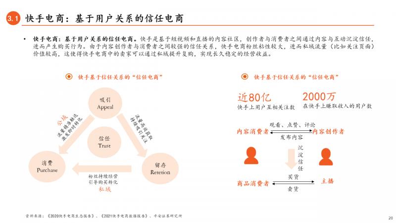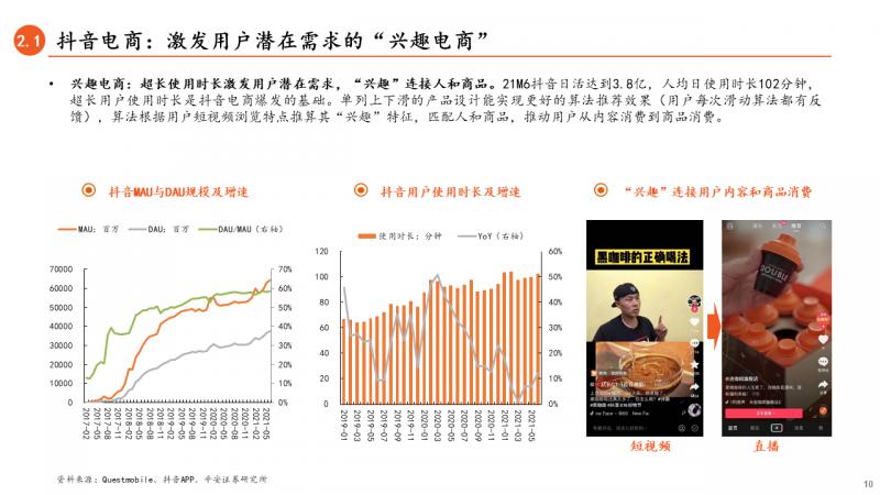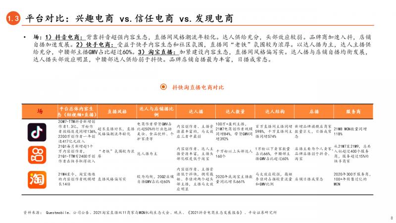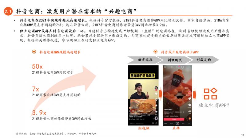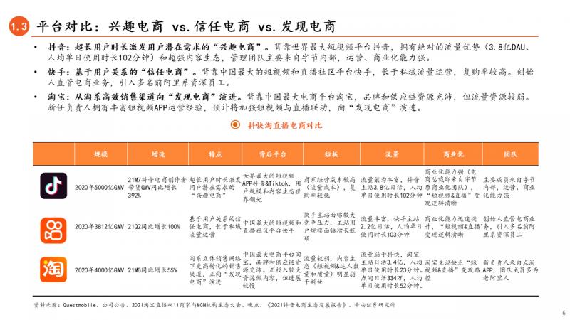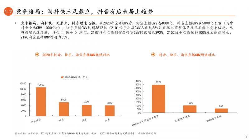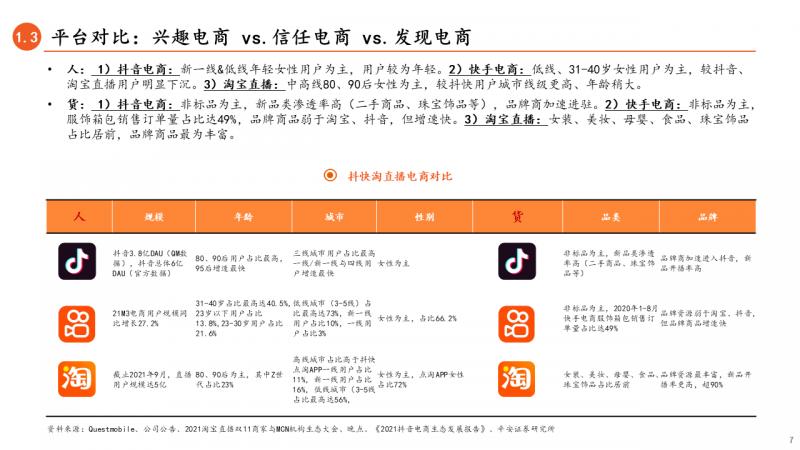 2021年直播電商行業繼續高速增長,受益于電商基礎設施和用戶滲透率的提升,抖音電商異軍突起增速高于同業。而抖音、快手、淘寶直播定位各有不同,分別定位“興趣電商”、“信任電商”、“發現式電商”,抖快淘三足鼎立的格局至此形成。