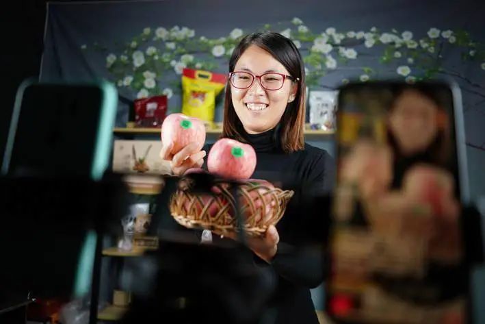 “電商+直播”助力農(nóng)產(chǎn)品銷售。圖為近日在河北省內(nèi)丘縣跨境電子商務(wù)產(chǎn)業(yè)園,電商人員通過(guò)網(wǎng)絡(luò)直播銷售蘋果 新華社圖