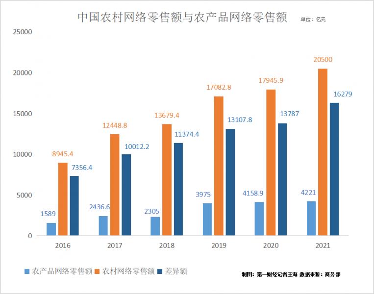 2021年,農村網絡零售額與農產品網絡零售額的差距更是擴大到超過1.6萬億元。
