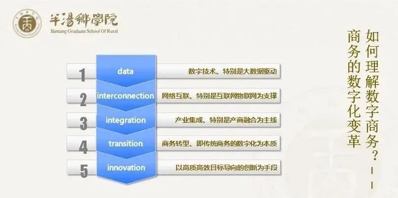 把這五個關鍵詞結合起來,我們可以得到如下概念:數字商務指的是以數字技術特別是大數據應用為驅動,以網絡互聯特別是以互聯網、物聯網為支撐,以產業集成特別是產商融合為主線,以商務轉型即傳統商務的數字化為本質,以高質量高效益為目標的創新實現的商務變革。