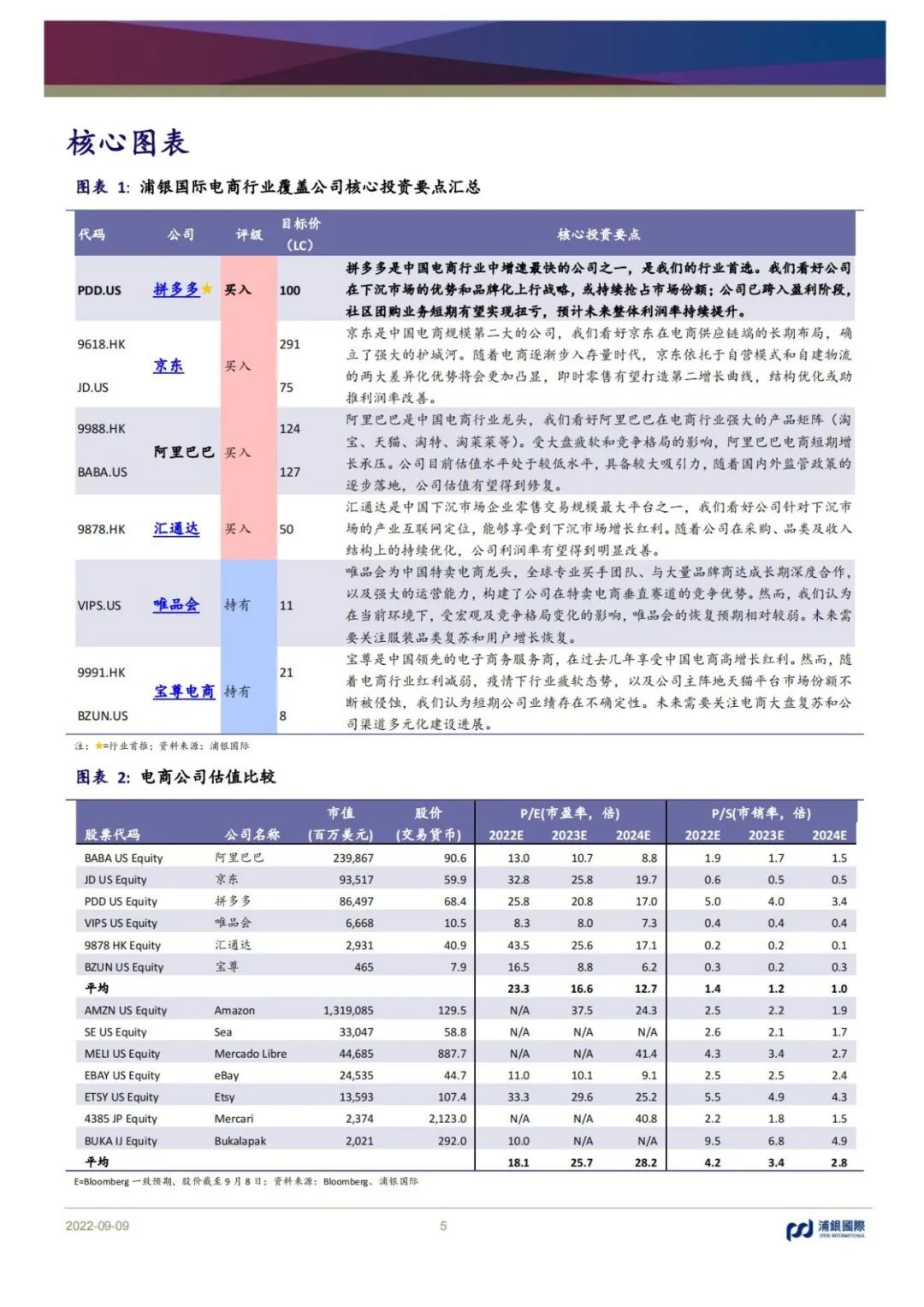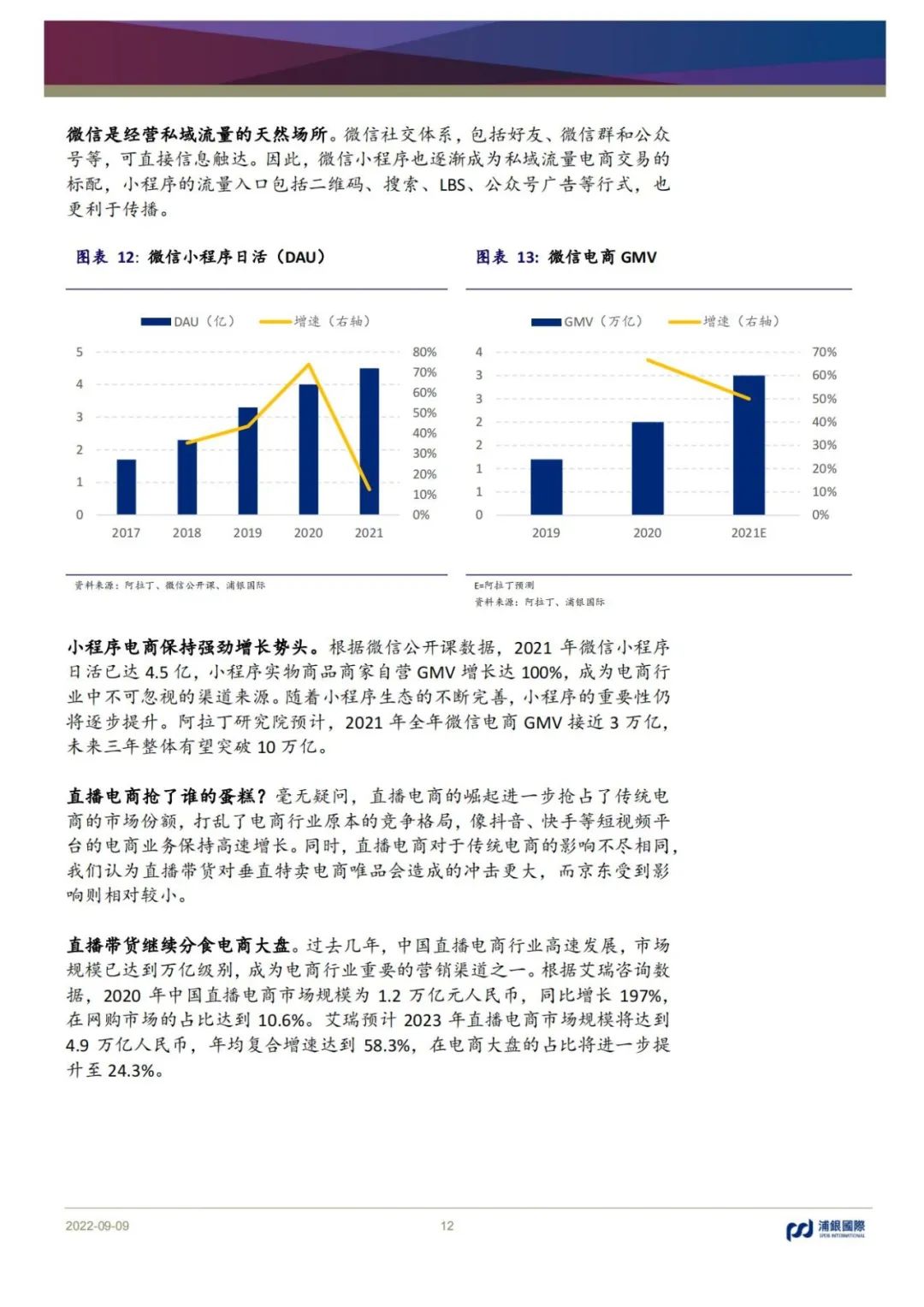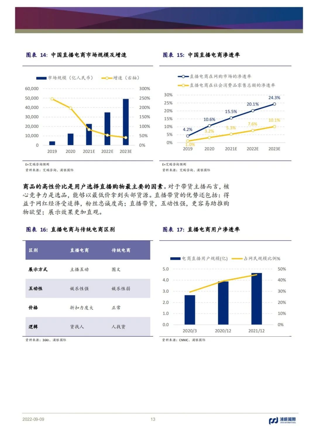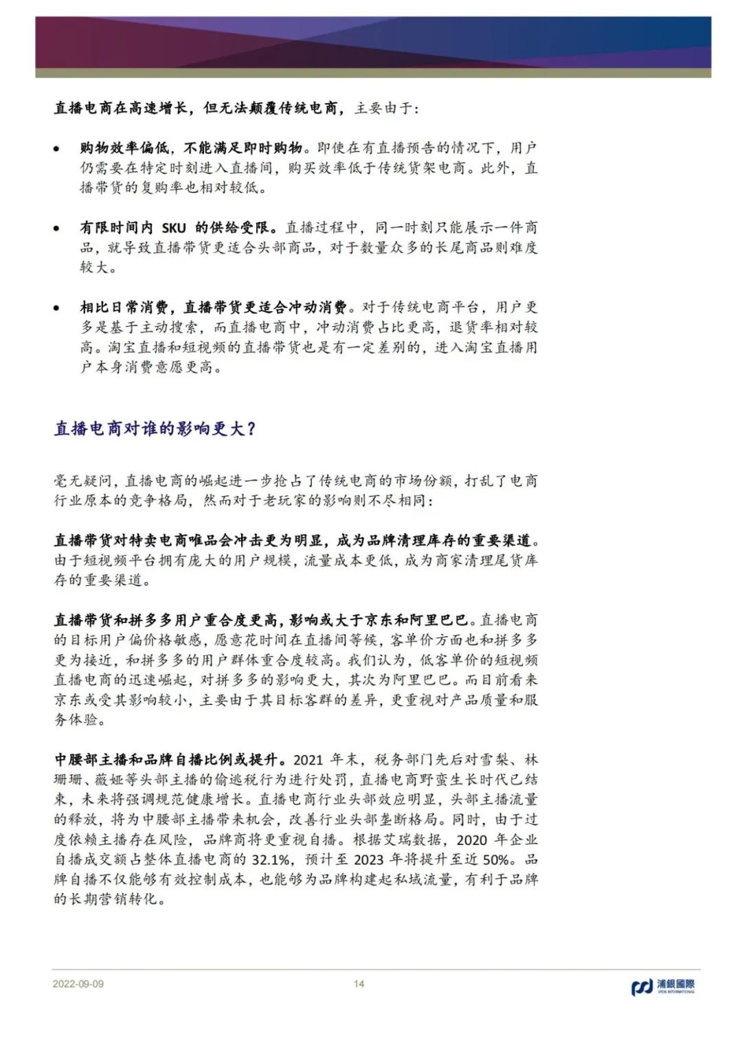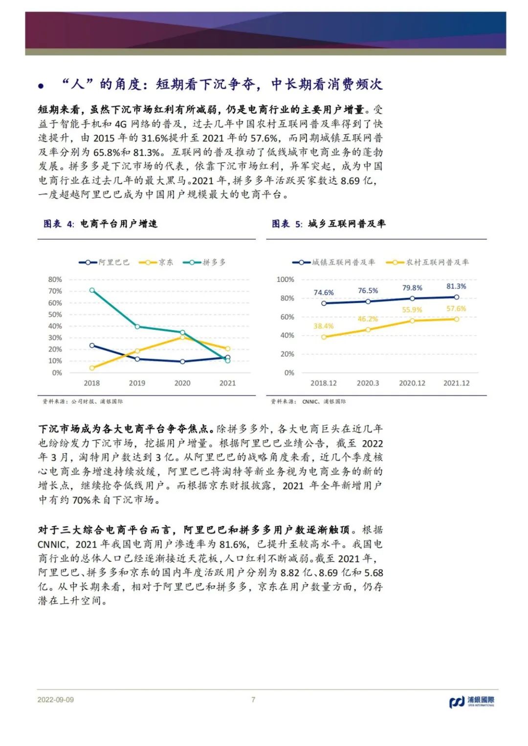 拼多多演繹“農村包圍城市”,品牌上行初見成效,增速領先,利潤釋放;京東相對穩健,供應鏈護城河優勢明顯,結構優化或助推利潤率改善;匯通達依靠交易+服務雙輪驅動,關注毛利率改善機會;唯品會的特賣模式受直播帶貨沖擊明顯,短期增長乏力;電商代運營增速放緩,短期承壓。