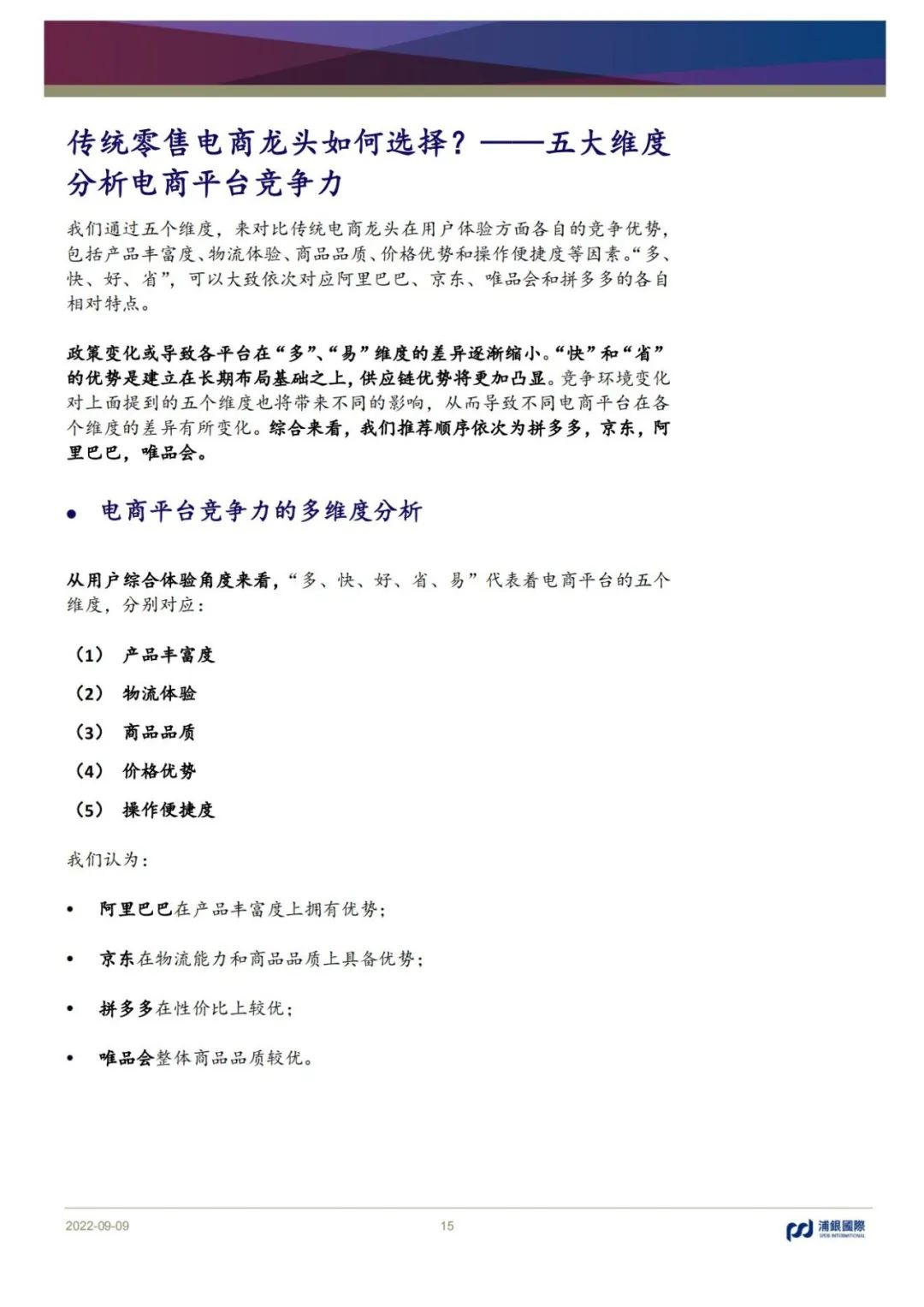 報告從“多、快、好、省、易”五個維度,分析了競爭環境變化對傳統電商龍頭的差異化影響,覆蓋五家電商企業。
