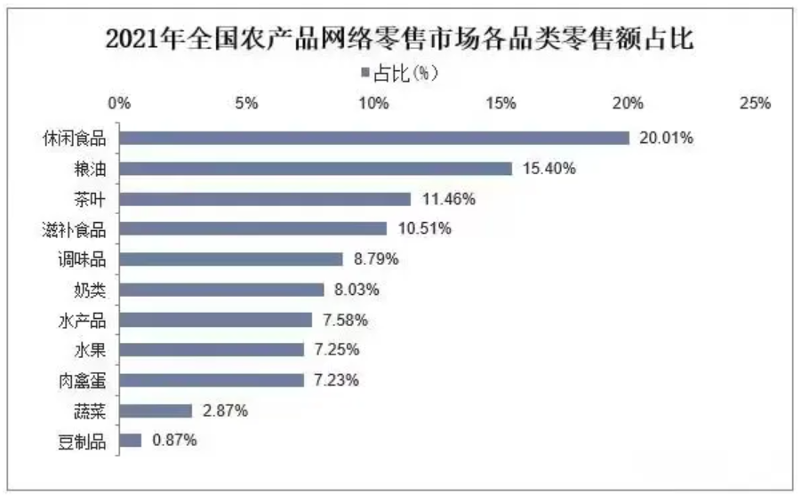 商務大數據監測顯示,2021年全國農產品網絡零售額4221億元,同比增長2.8%。分品類看,零售額前三名的品類分別是休閑食品、糧油和茶葉,分別占農產品網絡零售額的20.0%、15.4%和11.5%。