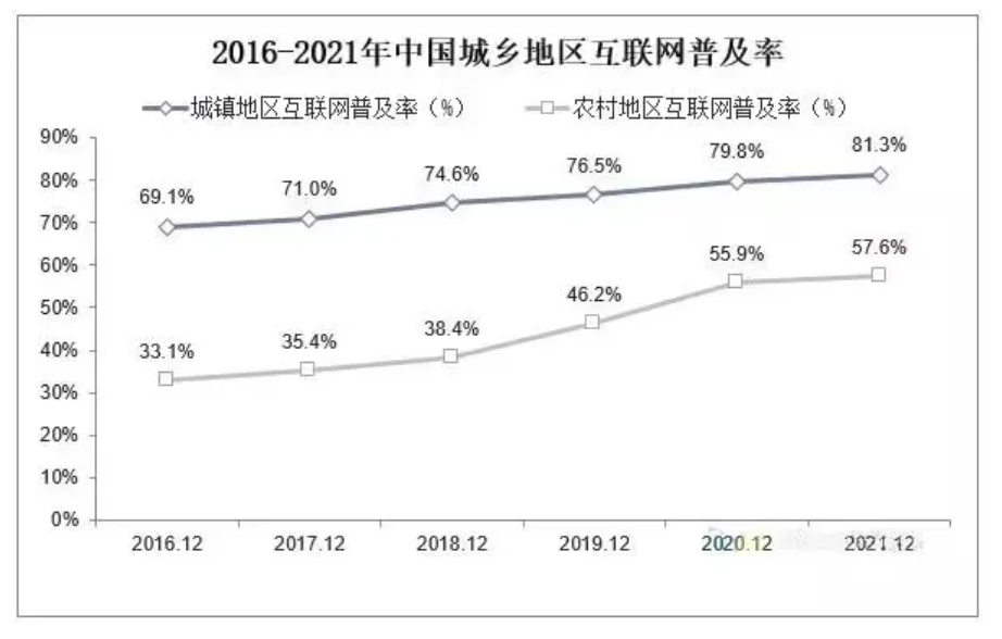 2022年6月,我國現有行政村已全面實現“縣縣通5G、村村通寬帶”。行政村通光纖比例從不到70%提升至100%,平均下載速率超過10OMb/s,基本實現與城市同網同速。農村地區互聯網普及率進一步提升。據第50次《中國互聯網絡發展狀況統計報告》顯示,2022年6月我國農村網民規模2.93億。農村地區互聯網普及率為58.8%。