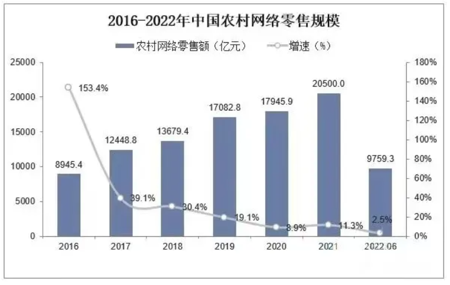 商務大數據監測顯示,2021年全國農村網絡零售額2.05萬億元,占全國網絡零售額的15.66%,同比增長 11.3%。2022年上半年,全國農村網絡零售額9759.3億元,同比增長2.5%。其中,農村實物商品網絡零售額8904.4億元,同比增長3.6%。