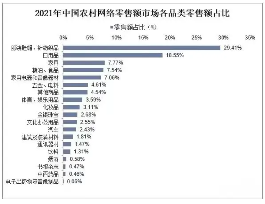 分品類看,零售額前三位的品類分別為服裝鞋帽針紡織品、日用品和家具,分別占農村實物商品網絡零售額的29.41%、18.55%和7.77%。