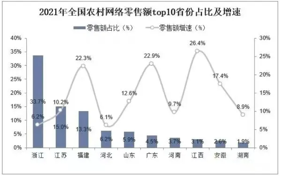分省份看,浙江、江蘇、福建、河北和山東農村網絡零售額排名前五,合計占全國農村網絡零售額比重為74.0%,零售額前十位省份合計占比為89.8%。從增速來看,海南、寧夏、江西、新疆和廣東同比增速位列前五,增速在20%以上。
