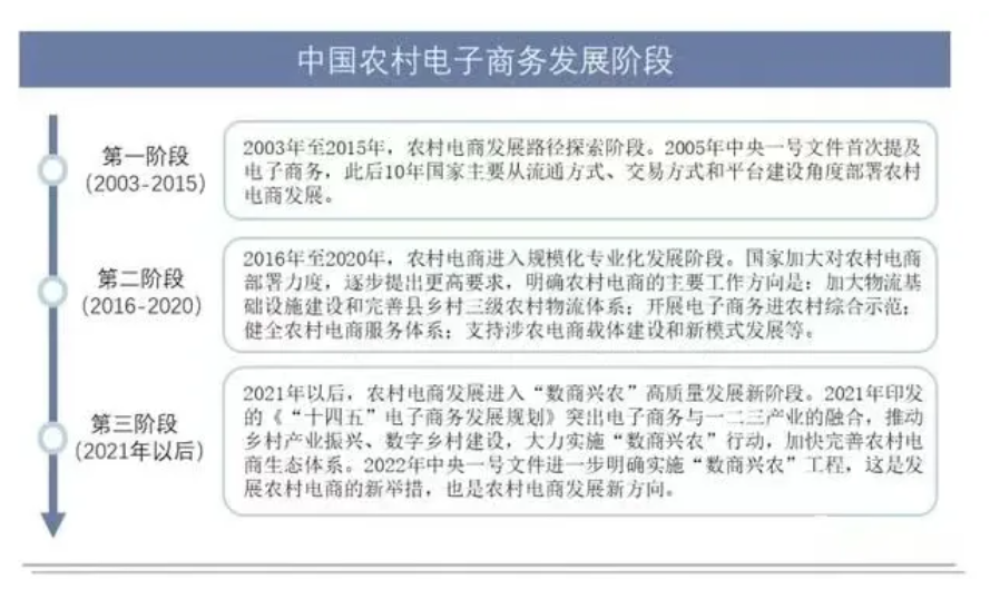 電子商務是我國數字經濟的重要源頭,是數字經濟最活躍、最集中的新產業新業態新模式,是數字經濟最重要的組成部分。實踐證明,農村電商是發展數字經濟、鄉村振興和數字鄉村建設最好的抓手,在十幾年的發展中,我國農村電商發展進程大體可分為三個階段。