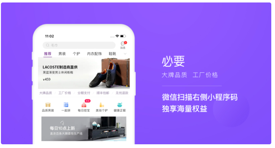 客觀上講,早期的折800、卷皮網(wǎng)算是真正意義上的垂直特賣平臺(tái)了,但是隨著PDD的普及以及人民生活水平的普遍提高,折800/卷皮這類純低價(jià)特賣的網(wǎng)站已經(jīng)缺乏生機(jī)了,咱們今天重點(diǎn)關(guān)注一下主打“大牌品質(zhì) 工廠價(jià)格”的C2M反向定制平臺(tái)——必要。