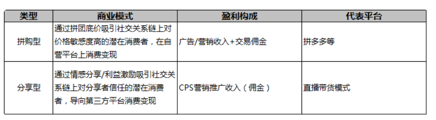 該模式下,平臺(tái)依托社交關(guān)系鏈促進(jìn)用戶裂變和商品傳播,按照平臺(tái)商品是否自營(yíng)同樣可分為2類,具體的商業(yè)模式與盈利構(gòu)成如下表: