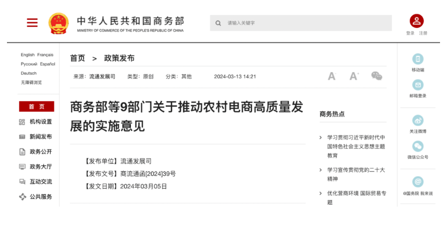 發(fā)展農(nóng)村電商,是創(chuàng)新商業(yè)模式、建設(shè)農(nóng)村現(xiàn)代流通體系的重要舉措,是轉(zhuǎn)變農(nóng)業(yè)發(fā)展方式、帶動農(nóng)民增收的有效抓手,是促進(jìn)農(nóng)村消費(fèi)、滿足人民對美好生活向往的有力支撐。近年來,商務(wù)部會同有關(guān)部門大力發(fā)展農(nóng)村電商,基本建立起縣鄉(xiāng)村三級電子商務(wù)服務(wù)體系和物流配送體系,在助力脫貧攻堅和全面推進(jìn)鄉(xiāng)村振興中發(fā)揮了積極作用,落實2024年中央一號文件部署,推動農(nóng)村電商高質(zhì)量發(fā)展,服務(wù)構(gòu)建新發(fā)展格局,現(xiàn)提出如下意見。