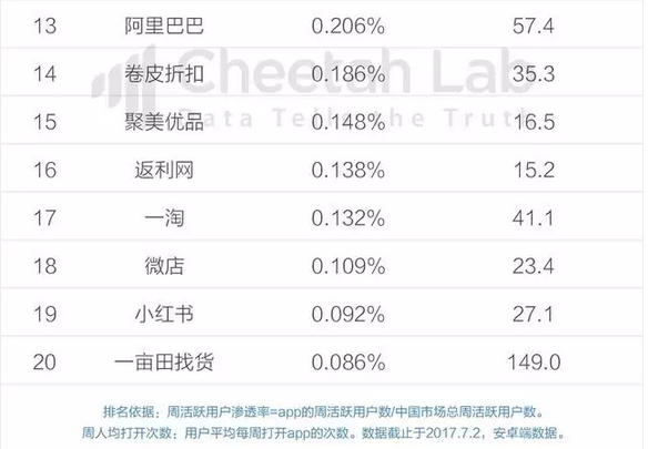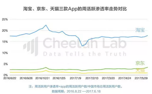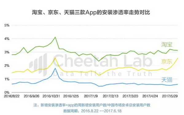 而從幾家頭部電商App的活躍、安裝滲透率走勢來看,近一年來,天貓、淘寶、京東的周活躍滲透率與新增安裝率走勢大體趨同,總體趨于平緩,沒有明顯增長。這幾款App活躍滲透率與安裝滲透率的高點也都只發生在雙11促銷期間。