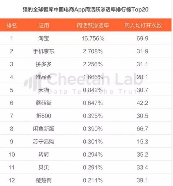 與此同時,經過了十幾年的發展,中國電商的大格局已經基本固定。從libra中國電商App周活躍滲透率排行榜來看,處于電商第一梯隊的平臺,包括淘寶、京東和天貓等已經占據了70%以上的市場份額,頭部優勢非常明顯。