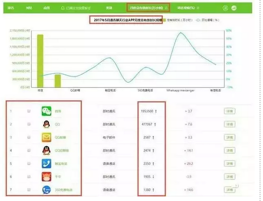 好,再來看下一張圖,我們講流量就必須以數據說話,這是2017年5月即時通訊聊天行業APP有效時長排行板。