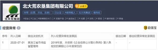 啟信寶數據顯示,7月1日,北大荒農墾集團有限公司被黑龍江省市場監督管理局列入經營異常名單,列入原因是:2019年度,未依照《企業信息公示暫行條例》第八條規定的期限公示年度報告。