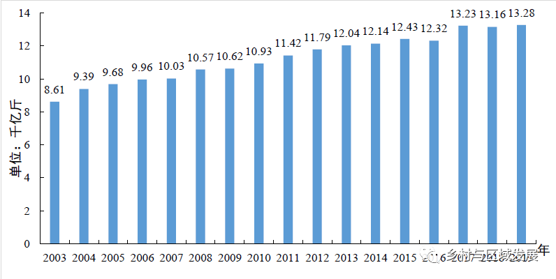 (一)為糧食安全和農(nóng)產(chǎn)品有效供給提供強(qiáng)有力的物質(zhì)裝備保障。在農(nóng)業(yè)勞動(dòng)力大量轉(zhuǎn)移的情況下,全國(guó)農(nóng)作物耕種收綜合機(jī)械化率由2003年的33.5%提高到2019年的70%(見圖1),糧食年總產(chǎn)量由2003年的8.61千億斤提高到2019年的13.28千億斤(見圖2),我國(guó)人口從2003年的12.88億人增加到目前的14億人,如果沒有農(nóng)業(yè)機(jī)械化的發(fā)展,很難養(yǎng)活這么多人口。畜禽養(yǎng)殖、水產(chǎn)養(yǎng)殖、農(nóng)產(chǎn)品初加工、設(shè)施農(nóng)業(yè)、果菜茶等各產(chǎn)業(yè)機(jī)械化亦快速發(fā)展。