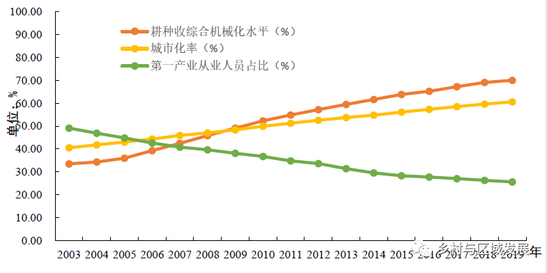 圖3 2003-2019年全國(guó)農(nóng)作物耕種收綜合機(jī)械化率、城市化率、第一產(chǎn)業(yè)人員占全社會(huì)從業(yè)人員比重變化圖