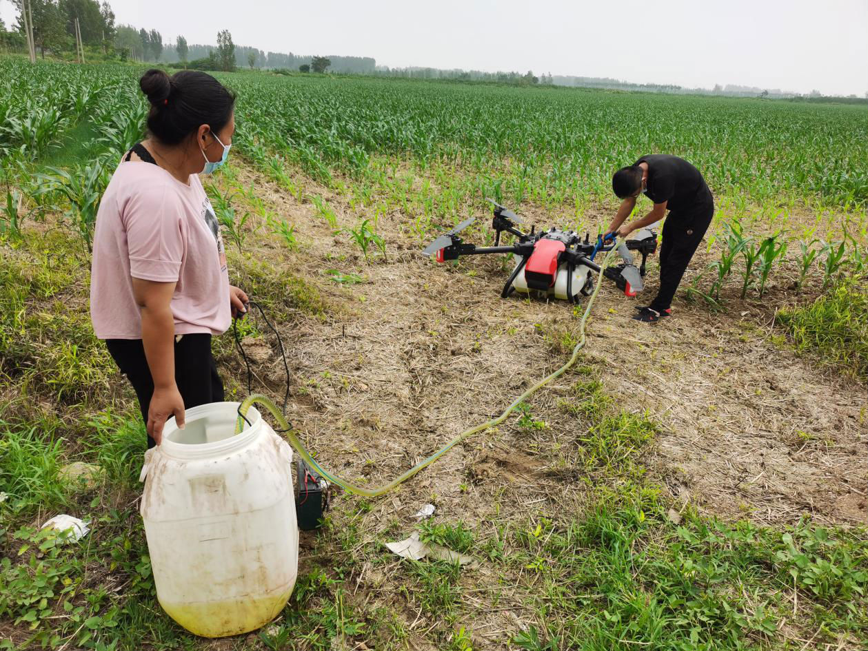 孫會和郝團結夫婦共計承包了1000多畝農田,種植玉米、小麥和紅薯等農作物。這么大規模的農田就單種植一季玉米,算上除草、殺蟲還有撒肥至少也得進行4到5次植保作業,在過去要想不誤農時,就得請人或者租用大型機械設備。但人工打藥成本高,還有中暑的風險;拖拉機式的打藥器又容易碾壞莊稼,100畝農田就浪費3畝地的糧食。因此,在親身體驗到農業無人機的高效后,孫姐今年就干脆自己買了兩臺。