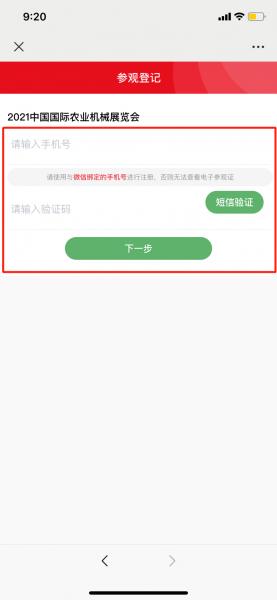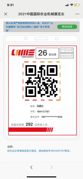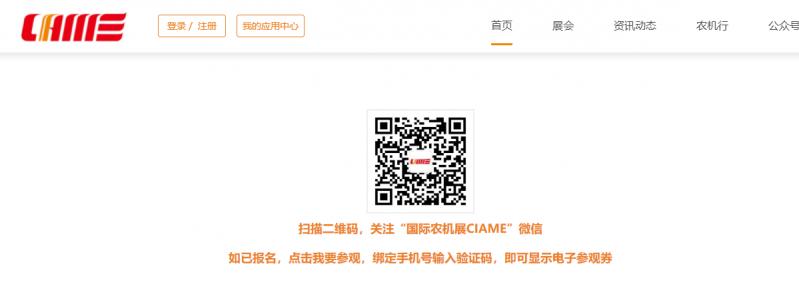 2.登錄國際農機展官網(www.camf.com.cn),或中國農業機械流通協會官網(www.camda.cn),或中國農業機械化協會官網(www.cama.org.cn),或中國農業機械工業協會官網(www.caamm.org.cn),點擊“我要參觀”,實名填報-個人基本信息-調查問卷,提交后關注國際農機展官方微信(國際農機展CIAME),點擊“我要參觀”并綁定手機號碼,生成閃爍二維碼的“電子參觀券”。持有本人“電子參觀券”現場掃描二維碼快速入場,并領取《觀眾證》入場參觀。