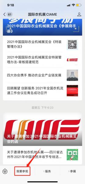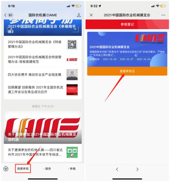 7、入場參觀時,請打開“國際農機展CIAME”公眾號,點擊“我要參觀”,然后點擊“查看參觀證”,即可顯示參觀二維碼