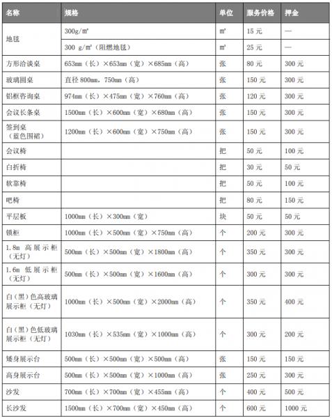 室內標準展位,是指已搭建完畢的標準展具3米×3米立體尺寸之內的地面及空間。標準展位企業名稱楣板一塊,(雙開口展位楣板兩塊),內容包括展位號及單位名稱(單位名稱以參展報名填報內容為準)、220V/5A單項電源插座1個、照明燈2只、咨詢桌1張、椅子2把。
