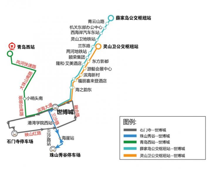 西海岸汽車總站--唐島灣路東站--鐵橛山路東站--隆泰國際站--市民服務中心站--同濟醫院站--五中站--珠海二區站--海王路站--珠海辦事處站--環球集團站--大河東站--金海濱置業西站--東和科技站--山興集團站--海濱八路站--阡上站--阡上南站--瑯琊臺集團站(世博城)