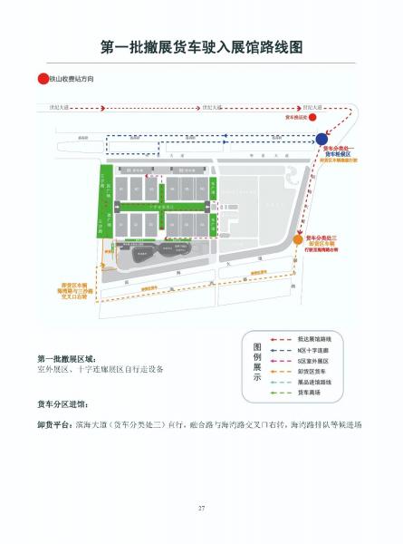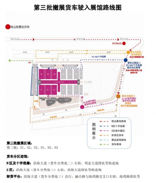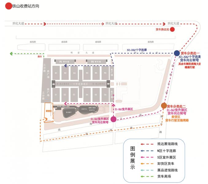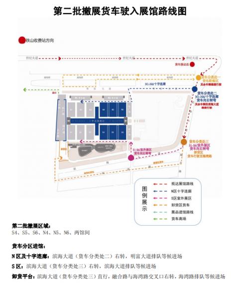 【提示】在布撤展期間,運送展品、展具物品進入展場的車輛必須服從工作人員指揮,按導示牌指引有序入場,不得隨意停靠;為保持展區內道路暢通,必要時車輛須循環行駛;在展場區域內所有車輛嚴禁高速行駛和超載;裝卸貨物須到指定卸貨區作業;載重5噸以下的車輛可以進入展廳。