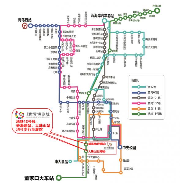 青島西站--孟家莊--金惠雪佛蘭--劉家園--嘉富路--聾啞學校--辛莊--黃島車管所--珠海辦事處北--第二中醫醫院--東樓路--山興匯龍城--袁家村北--袁家村南--黃島七中--亞飛車行--世紀公寓--瑯琊臺路南站--飛宇路--世紀大道地鐵站--大河東站--金海濱置業--圣元站--小河東--海之韻--世博城北站--瑯琊臺集團(世博城)