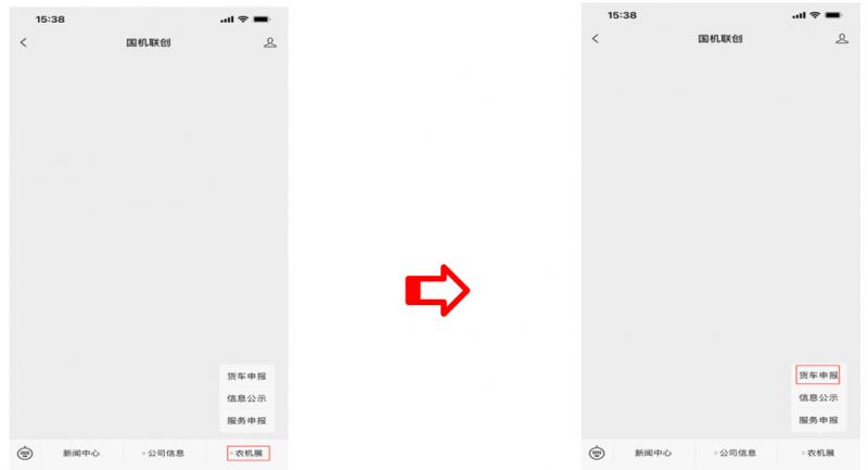 1、關注“國機聯創”微信公眾號;點擊右下角“農機展”—“貨車申報”;