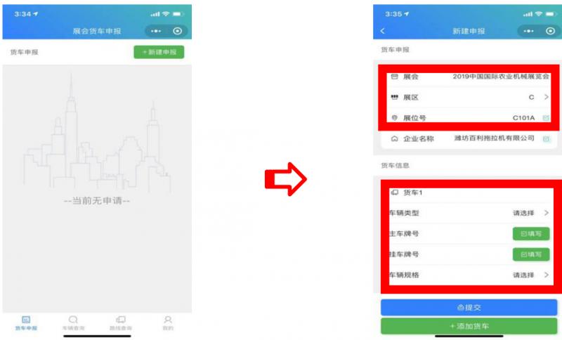 2、貨車申報界面后,點擊右上角“新建申報”;在界面中將展位信息及車輛信息填寫完整,點擊提交;